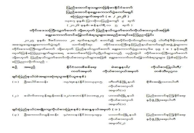 ပြည်ထောင်စုသမ္မတမြန်မာနိုင်ငံတော် ပြည်ထောင်စုရွေးကောက်ပွဲကော်မရှင် ကြေညာချက်အမှတ် (၉/၂၀၂၆) ၁၃၈၇ ခုနှစ်၊ ပြာသိုလပြည့်ကျော် ၄ ရက် (၂၀၂၆ ခုနှစ်၊ ဇန်နဝါရီလ ၆ ရက်) တိုင်းဒေသကြီးလွှတ်တော် သို့မဟုတ် ပြည်နယ်လွှတ်တော်ကိုယ်စားလှယ်အဖြစ် ရွေးကောက်တင်မြှောက်ခံရသူများအမည်စာရင်းကြေညာခြင်း