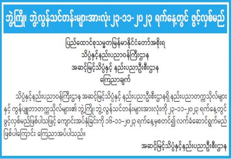 အီလက်ထရောနစ်နည်းပညာကို အသုံးပြု၍ Digital Platform ဖြစ်သော Mobile Application နှင့် Website များတွင် E-Book ထုတ်ဝေစာများ ဆောင်ရွက်နေမှုနှင့်ပတ်သက်၍ အသိပေးကြေညာချက်
