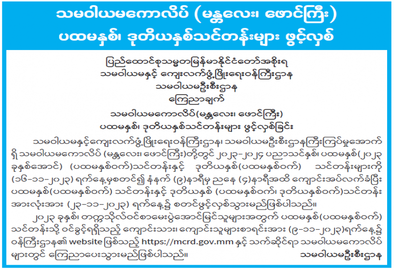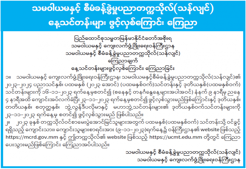 ၁။ သမဝါယမနှင့်ကျေးလက်ဖွံ့ဖြိုးရေးဝန်ကြီးဌာန၊ သမဝါယမနှင့်စီမံခန့်ခွဲမှုပညာတက္ကသိုလ်(သန်လျင်)၏ ၂၀၂၃-၂၀၂၄ ပညာသင်နှစ်၊ ပထမနှစ်(၂၀၂၃ အောင်) (ပထမနှစ်ဝက်)သင်တန်းနှင့် ဒုတိယနှစ် (ပထမနှစ်ဝက်)သင်တန်းများကို ၁၆-၁၁-၂၀၂၃ ရက်နေ့မှစတင်၍ (စနေနှင့် တနင်္ဂနွေနေ့များအပါအဝင်) နံနက် ၉ နာရီမှ ညနေ ၄ နာရီအထိ ကျောင်းအပ်လက်ခံပြီး ၂၃-၁၁-၂၀၂၃ ရက်နေ့မှစတင်၍ ဖွင့်လှစ်သွားမည်ဖြစ်ကြောင်းနှင့် ဒုတိယနှစ်၊ တတိယနှစ်၊ စတုတ္ထနှစ်၊ ဘွဲ့လွန်ဒီပလိုမာနှင့် မဟာဘွဲ့သင်တန်းများ၏ ဒုတိယနှစ်ဝက်သင်တန်းများကို ၂၃-၁၁-၂၀၂၃ ရက်နေ့မှ စတင်၍ ဖွင့်လှစ်သွားမည်ဖြစ်ပါသည်။
