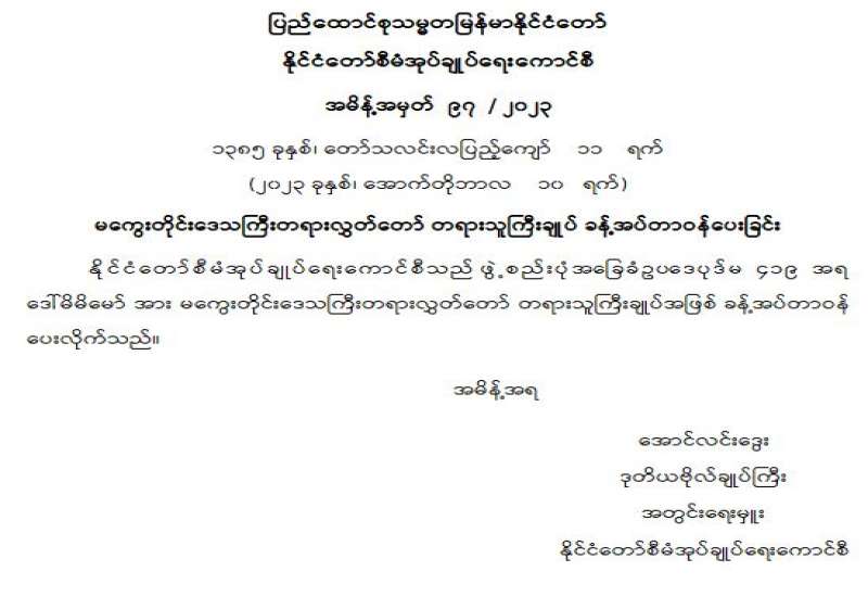 ပို့ဆောင်ရေးနှင့်ဆက်သွယ်ရေးဝန်ကြီးဌာနသည် ဆက်သွယ်ရေး ဥပဒေ ပုဒ်မ ၈၈ ပုဒ်မခွဲ (ခ) အရ အပ်နှင်းထားသော လုပ်ပိုင်ခွင့်ကို ကျင့်သုံး၍ ဤအမိန့်ကြော်ငြာစာကို ထုတ်ပြန်လိုက်သည်။