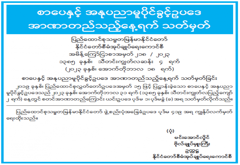 ၂၀၁၄ ခုနှစ်၊ ပုံနှိပ်ခြင်းနှင့်ထုတ်ဝေခြင်းလုပ်ငန်းဥပဒေ၊ နည်းဥပဒေများအရ ထုတ်ဝေသူများသည် မိမိတို့ထုတ်ဝေသည့် စာအုပ်စာစောင် ၅ အုပ် သို့မဟုတ် ၅ စောင်ကို ပြန်ကြားရေးဝန်ကြီးဌာနသို့ အဖိုးအခလွတ်ပေးအပ်ရမည်ဖြစ်ပါသည်။ ပြန်ကြားရေးဝန်ကြီးဌာနသည် အဆိုပါ စာအုပ်စာစောင်များကို မူပိုင်ခွင့်နှင့်စာအုပ်စာရင်း ၂ အုပ်၊ အမျိုးသားစာပေဆုစိစစ်ရွေးချယ်ရေးကော်မတီသို့ ၂ အုပ်နှင့် အမျိုးသား မှတ်တမ်းများမော်ကွန်းတိုက်ဦးစီးဌာနသို့ ၁ အုပ် ပေးပို့လျက်ရှိပါသည်။