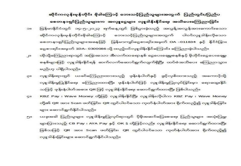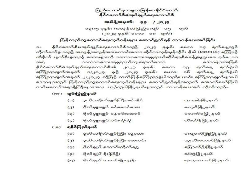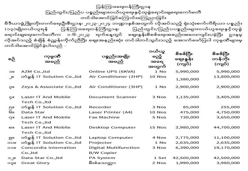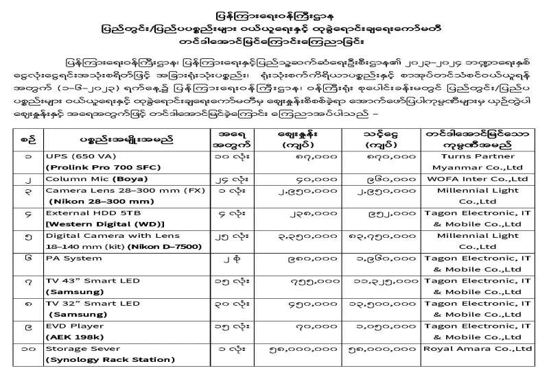 ပြန်ကြားရေးဝန်ကြီးဌာန ပြည်တွင်း/ပြည်ပ ပစ္စည်းများဝယ်ယူရေးနှင့် ထုခွဲရောင်းချရေးကော်မတီ တင်ဒါအောင်မြင်ကြောင်း ကြေညာခြင်း