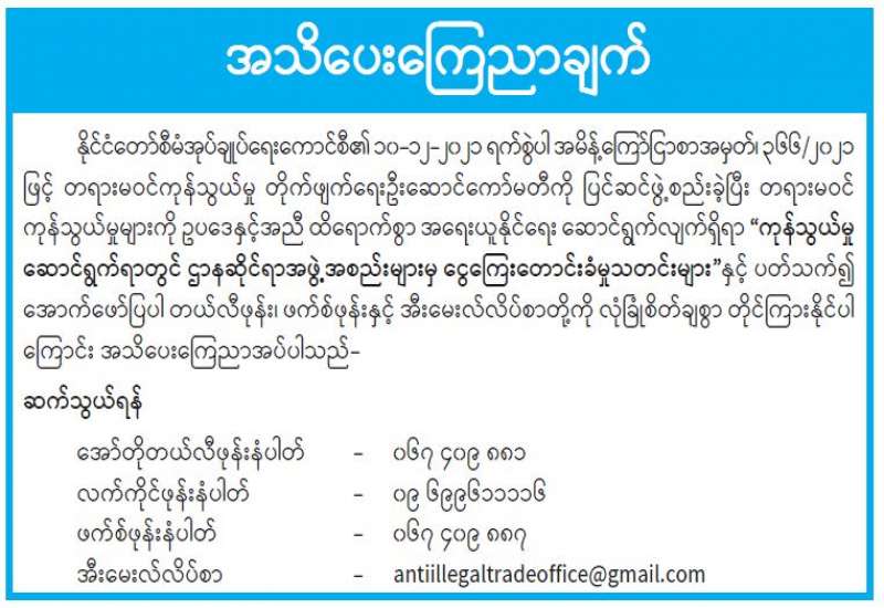 ၁။ သယံဇာတနှင့် သဘာဝပတ်ဝန်းကျင်ထိန်းသိမ်းရေးဝန်ကြီးဌာန၏ ပူးတွဲကြီးကြပ်မှုဖြင့် မြန်မာ့ကျောက်မျက်ရတနာပြပွဲဗဟိုကော်မတီသည် ၂၀၂၃ ခုနှစ်၊ (၅၈)ကြိမ်မြောက် မြန်မာ့ကျောက်မျက်ရတနာပြပွဲကို မတ် ၁၇ ရက်မှ ၂၃ ရက်အထိ နေပြည်တော် မဏိရတနာ ကျောက်စိမ်းခန်းမ၌ ကျင်းပပြုလုပ်မည်ဖြစ်ပြီး ရတနာပြပွဲတွင် မြန်မာနိုင်ငံမှထွက်ရှိသော ပုလဲ၊ ကျောက်မျက်နှင့် ကျောက်စိမ်းအတွဲများကို တင်ပြရောင်းချသွားမည်ဖြစ်သည်။