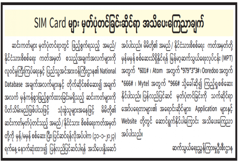 SIM Card များ မှတ်ပုံတင်ခြင်းဆိုင်ရာ အသိပေးကြေညာချက်