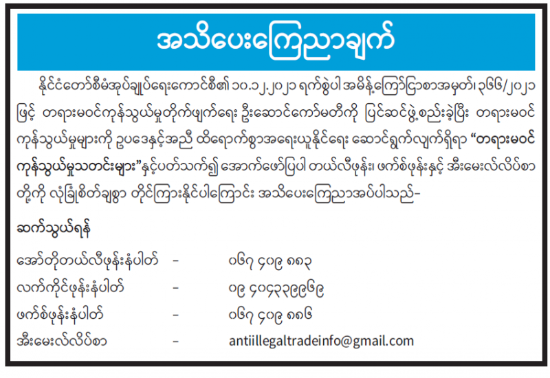 “တရားမဝင်ကုန်သွယ်မှုသတင်းများ”နှင့်ပတ်သက်၍ အသိပေးကြေညာချက်
