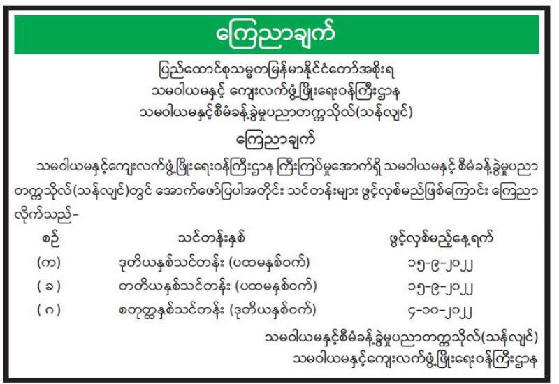 ကိုဗစ်-၁၉ ရောဂါပိုး   ကူးစက်ပျံ့နှံ့မှုကို  ဆက်လက်ထိန်းချုပ်ဆောင်ရွက်ရန်   လိုအပ်ပါသဖြင့် ပြည်ထောင်စုအဆင့် အဖွဲ့အစည်းများ၊ ပြည်ထောင်စုဝန်ကြီးဌာနများမှ ကိုဗစ်-၁၉ ရောဂါ ကာကွယ်၊ ထိန်းချုပ်၊  တားဆီးရေးအတွက် ၂၀၂၂ ခုနှစ်၊  ဩဂုတ်လ ၃၁ ရက်နေ့အထိ  ထုတ်ပြန်ထားသော ပြည်သူသို့ပန်ကြားချက်၊ အမိန့်၊ အမိန့်ကြော်ငြာစာ၊ ညွှန်ကြားချက်များ (ဖြေလျှော့ပေးမည့် ကိစ္စရပ်များ မပါ)  အား  ၂၀၂၂ ခုနှစ်၊  စက်တင်ဘာလ ၃၀ ရက်နေ့အထိ  ရက်တိုးမြှင့်သတ်မှတ်ထားပါကြောင်း အသိပေးကြေညာအပ်ပါသည်။