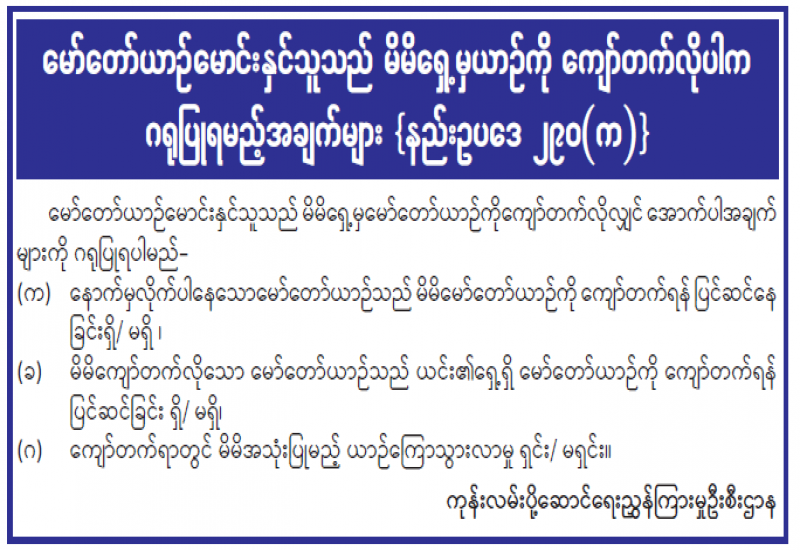 မော်တော်ယာဉ်မောင်းနှင်သူသည် မိမိရှေ့မှယာဉ်ကို ကျော်တက်လိုပါက ဂရုပြုရမည့်အချက်များ {နည်းဥပဒေ ၂၉၀(က)}