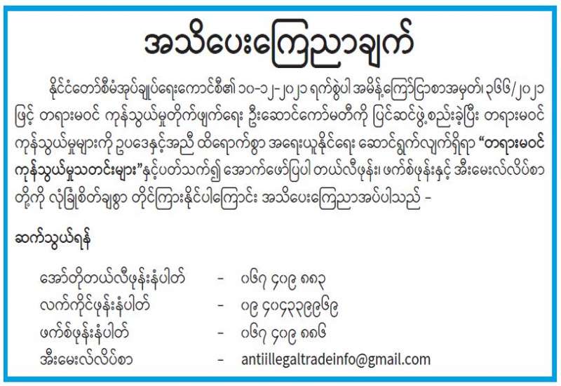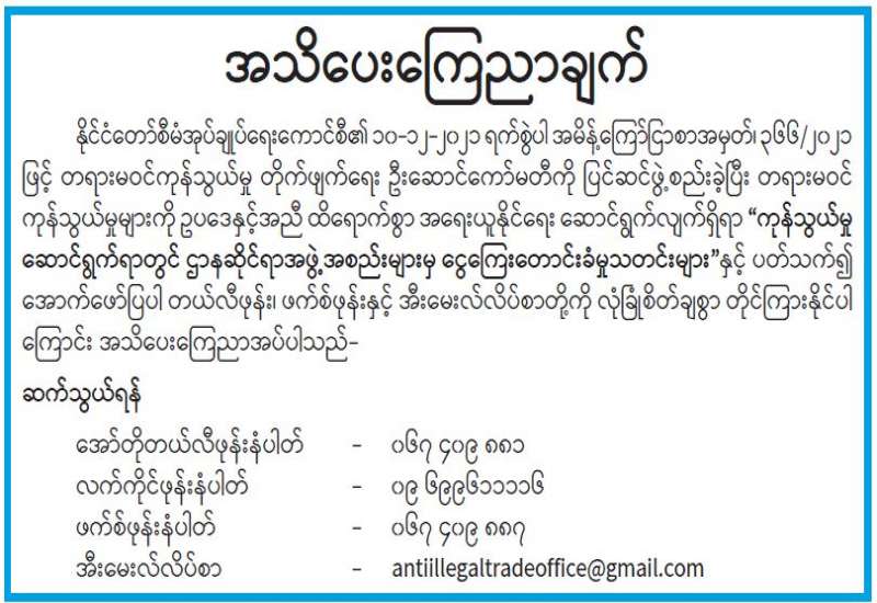 (၇၅)နှစ်မြောက် အာဇာနည်နေ့အထိမ်းအမှတ် အထူးပြပွဲခင်းကျင်းပြသရန် ကြိုတင်ပြင်ဆင်မှုလုပ်ငန်းများ ဆောင်ရွက်မည်ဖြစ်ပါသဖြင့် ဗိုလ်ချုပ်အောင်ဆန်းပြတိုက် (ရန်ကုန်)ကို (၂၅-၆-၂၀၂၂)ရက်နေ့မှ (၁၈-၇-၂၀၂၂)ရက်နေ့ထိ ခေတ္တပိတ်ထားမည် ဖြစ်ပါကြောင်းနှင့် အာဇာနည်နေ့တွင် ဗိုလ်ချုပ်အောင်ဆန်းပြတိုက် (ရန်ကုန်)နှင့် ဗိုလ်ချုပ်အောင်ဆန်းနေအိမ်ပြတိုက် (နတ်မောက်)တို့အား ယခင်နှစ်များအတိုင်း အခမဲ့ ဝင်ရောက်လေ့လာခွင့် ပြုမည်ဖြစ်ကြောင်း မေတ္တာရပ်ခံ အသိပေးအပ်ပါသည်။