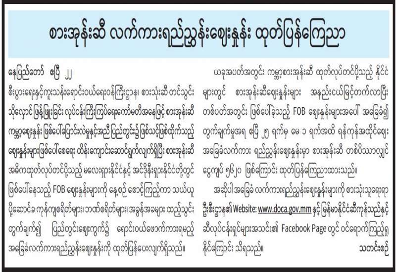 ပုံနှိပ်ခြင်းလုပ်ငန်း၊ ထုတ်ဝေခြင်းလုပ်ငန်းနှင့် သတင်းအေဂျင်စီလုပ်ငန်းလုပ်ကိုင်သူများ လုပ်ငန်းအသိအမှတ်ပြုလက်မှတ် အသစ်လဲလှယ်ရန် အသိပေးကြေညာခြင်း