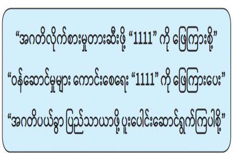 ၁။ ကျန်းမာရေးဝန်ကြီးဌာန၊ အစားအသောက်နှင့်ဆေးဝါးကွပ်ကဲရေးဦးစီးဌာန ကိုဗစ်-၁၉ ကာကွယ် ကုသရေးဆေးဝါးနှင့် ဆေးပစ္စည်းများနှင့် ပတ်သက်၍ အစားအသောက်နှင့် ဆေးဝါးကွပ်ကဲရေးဦးစီး ဌာနမှ ဖြေလျှော့ဆောင်ရွက်မှုများကို ဆေးဝါးအတွက် အသိပေးကြေညာချက်များအား (၂၂-၇-၂၀၂၁) နေ့တွင်လည်းကောင်း၊ (၂၇-၇-၂၀၂၁) ရက်နေ့တွင်လည်းကောင်း၊ (၁၃-၈-၂၀၂၁) ရက်နေ့တွင်လည်းကောင်း၊ Molnupiravir Tablet ကို (၁၇-၁၂-၂၀၂၁) ရက်နေ့တွင်လည်းကောင်း စုစုပေါင်း (၄) ကြိမ်၊ ဆေးပစ္စည်း အတွက် အသိပေးကြေညာချက်များအား (၂၂-၇-၂၀၂၁) ရက်နေ့တွင်လည်းကောင်း၊ (၁၇-၈-၂၀၂၁) ရက်နေ့တွင်လည်းကောင်း စုစုပေါင်း (၂) ကြိမ်နှင့် ကျန်းမာရေးအထောက်အကူပြု အစားအသောက်များ ဆရာဝန်ညွှန်ကြားချက် မလိုသော ဆေးဝါးများနှင့် ပတ်သက်၍ အသိပေးကြေညာချက်များအား (၂၇-၇-၂၀၂၁) ရက်နေ့တွင် (၁) ကြိမ် အများပြည်သူ သိရှိနိုင်ရန်အတွက် FDA ၏ Website (www.fda. gov.mm) နှင့် Food and Drug Administration Myanmar Facebook Page တို့တွင် ကြေညာခဲ့ပြီး ဖြစ်ပါသည်။