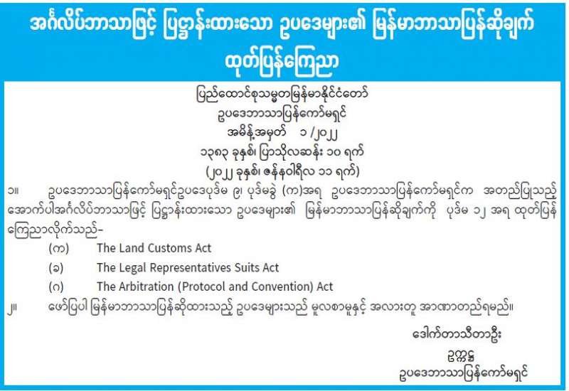 ဥပဒေဘာသာပြန်ကော်မရှင် အမိန့်အမှတ် ၁/၂၀၂၂ ထုတ်ပြန်