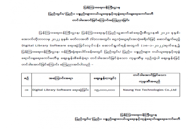 ၂၀၁၄ ခုနှစ် ပုံနှိပ်ခြင်းနှင့် ထုတ်ဝေခြင်းလုပ်ငန်းဥပဒေ၊ နည်းဥပဒေများအရ ပုံနှိပ်သူ၊ ထုတ်ဝေသူ များသည် မိမိတို့ထုတ်ဝေသည့် စာအုပ်စာစောင် ၆ အုပ် သို့မဟုတ် ၆ စောင်ကို ပြန်ကြားရေးဝန်ကြီး ဌာနသို့ အဖိုးအခလွတ် ပေးအပ်ရမည်ဖြစ်ပါသည်။ ပြန်ကြားရေးဝန်ကြီးဌာနသည် အဆိုပါစာအုပ် စာစောင်များကို အမျိုးသားစာကြည့်တိုက်၊ အမျိုးသားမှတ်တမ်းများ၊ မော်ကွန်းတိုက်ဦးစီးဌာနနှင့် အမျိုးသားစာပေဆုရွေးချယ်ရေးကော်မတီများသို့ ခွဲဝေပေးပို့လျက်ရှိပါသည်။