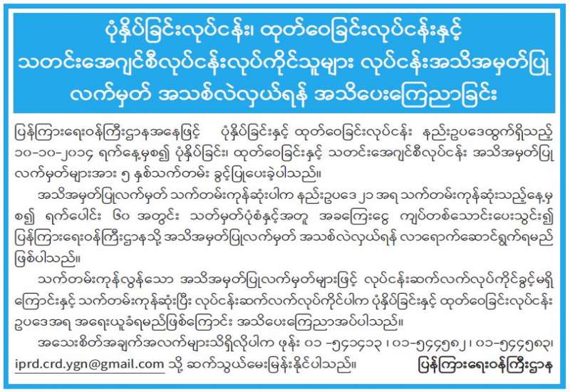 ပုံနှိပ်ခြင်းနှင့် ထုတ်ဝေခြင်းလုပ်ငန်းဥပဒေ၊ နည်းဥပဒေများနှင့်အညီ စာအုပ်စာစောင်များပေးအပ်ရန် အသိပေးကြေညာခြင်း
