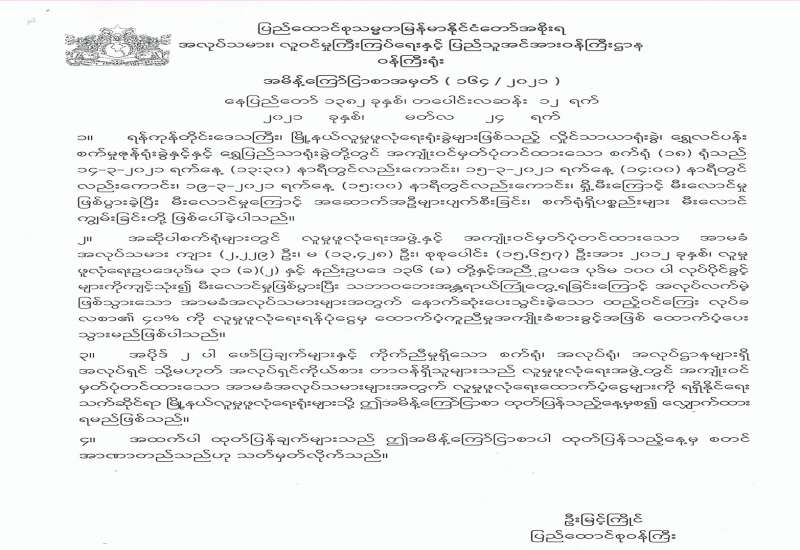 ၁။ နိုင်ငံတော်စီမံအုပ်ချုပ်ရေးကောင်စီ၏ ၁၃၈၂ ခုနှစ်၊ တပေါင်းလဆန်း ၂ ရက်၊ ၂၀၂၁ ခုနှစ်၊ မတ်လ ၁၄ ရက်စွဲပါ စစ်အုပ်ချုပ်ရေး(Martial Law)အမိန့်အမှတ် ၁/ ၂၀၂၁၊ ၁၃၈၂ ခုနှစ်၊ တပေါင်း လဆန်း ၃ ရက်၊ ၂၀၂၁ ခုနှစ်၊ မတ်လ ၁၅ ရက်စွဲပါ စစ်အုပ်ချုပ်ရေး(Martial Law)အမိန့်အမှတ် ၂/ ၂၀၂၁ တို့ ဖြင့် ရန်ကုန်တိုင်းစစ်ဌာနချုပ်၊ တိုင်းမှူးအား စစ်အုပ်ချုပ်ရေးဒေသအဖြစ် ကြေညာထားသော ရန်ကုန်တိုင်းစစ်ဌာနချုပ်နယ်မြေ ဖြစ်သည့် ရန်ကုန်တိုင်းဒေသကြီး၊ လှိုင်သာယာမြို့နယ်၊ ရွှေပြည်သာ မြို့နယ်၊ ဒဂုံမြို့သစ်(မြောက်ပိုင်း)မြို့နယ်၊ ဒဂုံမြို့သစ်(တောင်ပိုင်း)မြို့နယ်၊ ဒဂုံမြို့သစ်(ဆိပ်ကမ်း) မြို့နယ် နှင့် မြောက်ဥက္ကလာပမြို့နယ်များအတွင်း လုံခြုံရေး၊ တရားဥပဒေစိုးမိုးရေးနှင့် နယ်မြေအေးချမ်းသာယာ ရေးကို ပိုမိုထိရောက်စွာဆောင်ရွက်နိုင်ရန်အလို့ငှာ အုပ်ချုပ်ရေးနှင့် တရားစီရင်ရေးဆိုင်ရာ စစ်အုပ်ချုပ်ရေး (Martial Law) အာဏာကိုကျင့်သုံးရန် ဖွဲ့စည်းပုံအခြေခံဥပဒေ ပုဒ်မ ၄၁၉ အရ အပ်နှင်းခဲ့ပါသည်။