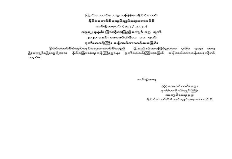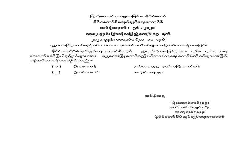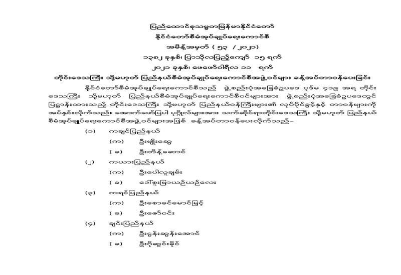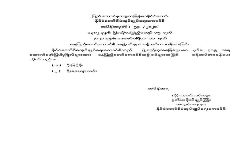 နိုင်ငံတော်စီမံအုပ်ချုပ်ရေးကောင်စီသည် ဖွဲ့စည်းပုံအခြေခံဥပဒေ ပုဒ်မ ၄၁၉ အရ အောက်ဖော်ပြပါပုဂ္ဂိုလ်များအား နေပြည်တော်ကောင်စီအဖွဲ့ဝင်များအဖြစ် ခန့်အပ်တာဝန်ပေး လိုက်သည် -