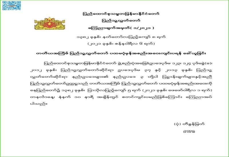 တတိယအကြိမ် ပြည်သူ့လွှတ်တော် ပထမပုံမှန်အစည်းအဝေးကျင်းပရန် ခေါ်ယူခြင်း