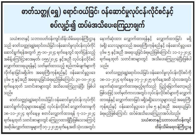 ဓာတ်သတ္တု (ရွှေ) ရောင်းဝယ်ခြင်း ဝန်ဆောင်မှုလုပ်ငန်းလိုင်စင်နှင့် စပ်လျဉ်း၍ ထပ်မံအသိပေးကြေညာချက်