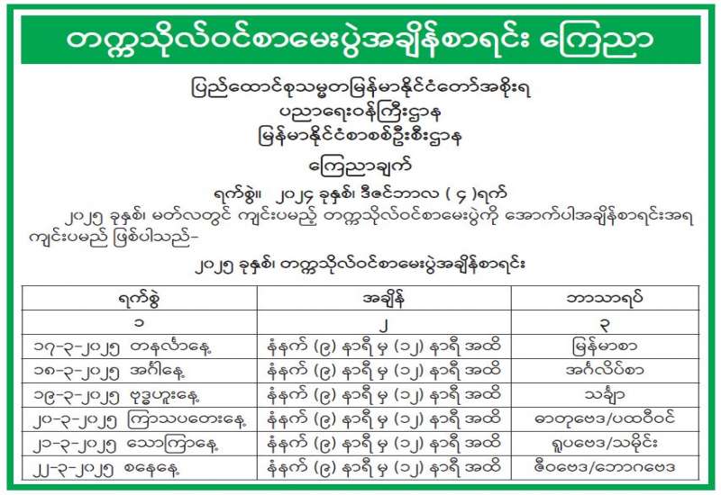 တက္ကသိုလ်ဝင်စာမေးပွဲအချိန်စာရင်း ကြေညာ