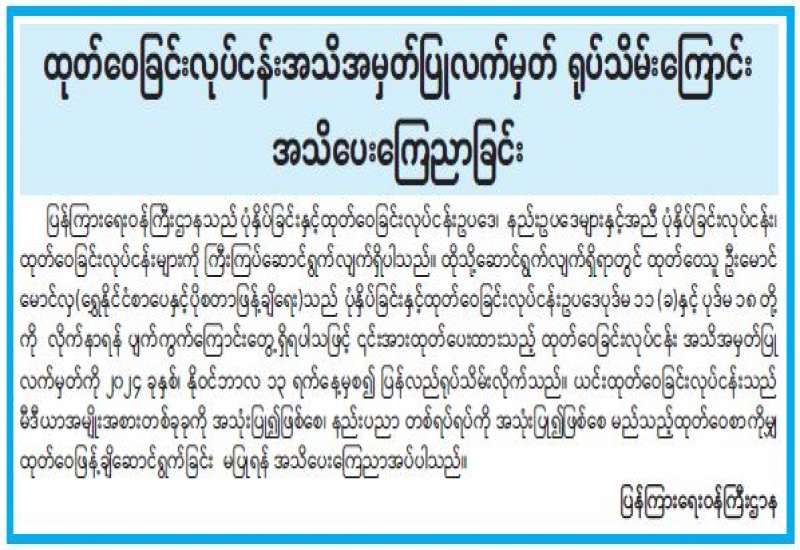 ၁။ ပြန်ကြားရေးဝန်ကြီးဌာနသည် ပုံနှိပ်ခြင်းနှင့်ထုတ်ဝေခြင်းလုပ်ငန်းဥပဒေ ပုဒ်မ ၈ ပါ စည်းကမ်းချက်တစ်ရပ်ရပ်နှင့် ငြိစွန်းသည်ဟု သံသယရှိသော ထုတ်ဝေစာကို ပုံနှိပ်၊ ထုတ်ဝေခဲ့ကြောင်း ခိုင်လုံသောအထောက်အထားဖြင့် သတင်းပေးပို့ခြင်းကို လက်ခံရရှိလျှင်သော်လည်းကောင်း၊ ကိုယ်တိုင်သိရှိလျှင်သော်လည်းကောင်း သတ်မှတ်ချက်နှင့်အညီ စစ်ဆေးပြီး ငြိစွန်းကြောင်းတွေ့ရှိပါက လုပ်ငန်းအသိအမှတ်ပြုလက်မှတ်ကို ပြန်လည်ရုပ်သိမ်းခြင်း သို့မဟုတ် ကာလအကန့်အသတ်ဖြင့် ရပ်ဆိုင်းခြင်းပြုနိုင်ကြောင်း ပုံနှိပ်ခြင်းနှင့်ထုတ်ဝေခြင်းလုပ်ငန်းဥပဒေပုဒ်မ ၆ တွင် ပြဋ္ဌာန်းထားရှိသည်။