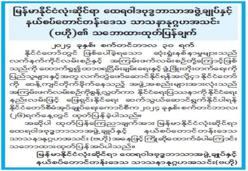 နိုင်ငံရေးပြဿနာအား နိုင်ငံရေးနည်းလမ်းဖြင့်ဖြေရှင်းရန် နိုင်ငံတော်စီမံအုပ်ချုပ်ရေးကောင်စီ၏ ကမ်းလှမ်းဖိတ်ခေါ်ခြင်းအပေါ် မြန်မာနိုင်ငံလုံးဆိုင်ရာ ထေရဝါဒဗုဒ္ဓဘာသာအဖွဲ့ချုပ်နှင့် နယ်စပ်တောင်တန်းဒေသ သာသနာနုဂ္ဂဟအသင်း (ဗဟို) က ကြိုဆိုထောက်ခံကြောင်း သဘောထားများထုတ်ပြန်