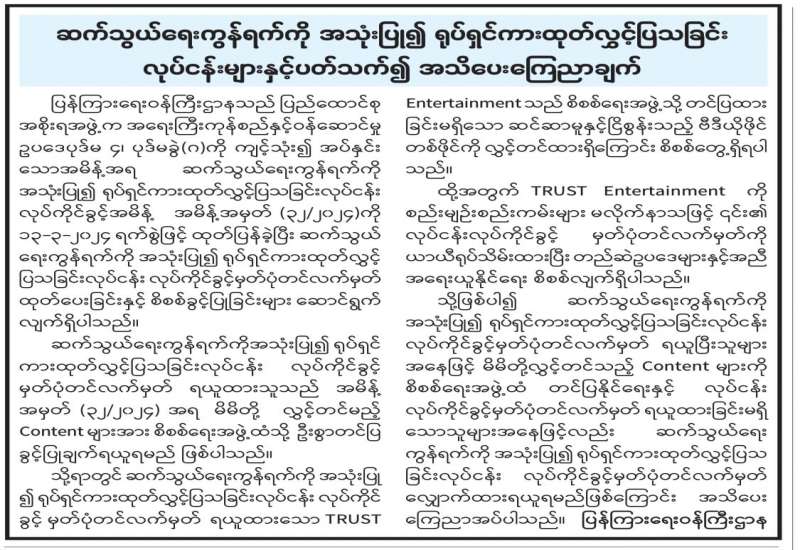 ပြန်ကြားရေးဝန်ကြီးဌာနသည် ပြည်ထောင်စုအစိုးရအဖွဲ့က အရေးကြီးကုန်စည်နှင့်ဝန်ဆောင်မှု ဥပဒေပုဒ်မ ၄၊ ပုဒ်မခွဲ(ဂ)ကို ကျင့်သုံး၍ အပ်နှင်းသောအမိန့်အရ ဆက်သွယ်ရေးကွန်ရက်ကို အသုံးပြု၍ ရုပ်ရှင်ကားထုတ်လွှင့်ပြသခြင်းလုပ်ငန်း လုပ်ကိုင်ခွင့်အမိန့် အမိန့်အမှတ် (၃၂/၂၀၂၄) ကို ၁၃-၃-၂၀၂၄ ရက်စွဲဖြင့်ထုတ်ပြန်ခဲ့ပြီး ဆက်သွယ်ရေးကွန်ရက်ကိုအသုံးပြု၍ ရုပ်ရှင်ကားထုတ်လွှင့် ပြသခြင်းလုပ်ငန်း လုပ်ကိုင်ခွင့်မှတ်ပုံတင်လက်မှတ် ထုတ်ပေးခြင်းနှင့် စိစစ်ခွင့်ပြုခြင်းများ ဆောင်ရွက်လျက်ရှိပါသည်။