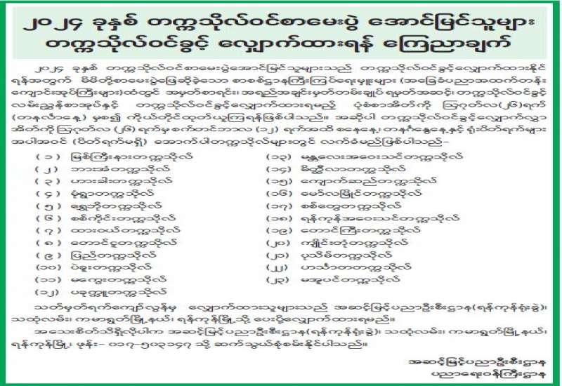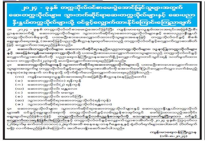 ၂၀၂၄ - ခုနှစ် တက္ကသိုလ်ဝင်စာမေးပွဲအောင်မြင်သူများအတွက် ဆေးတက္ကသိုလ်များ၊ သွားဘက်ဆိုင်ရာဆေးတက္ကသိုလ်များနှင့် ဆေးပညာနှီးနွှယ်တက္ကသိုလ်များသို့ ဝင်ခွင့်လျှောက်ထားနိုင်ကြောင်း ကြေညာချက်