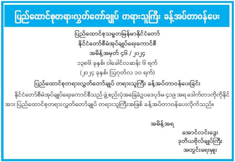 မြန်မာနိုင်ငံသတင်းမီဒီယာကောင်စီဝင်ရွေးချယ်တင်မြှောက်ပွဲ ကျင်းပမည်ဖြစ်ကြောင်း အသိပေးကြေညာခြင်း