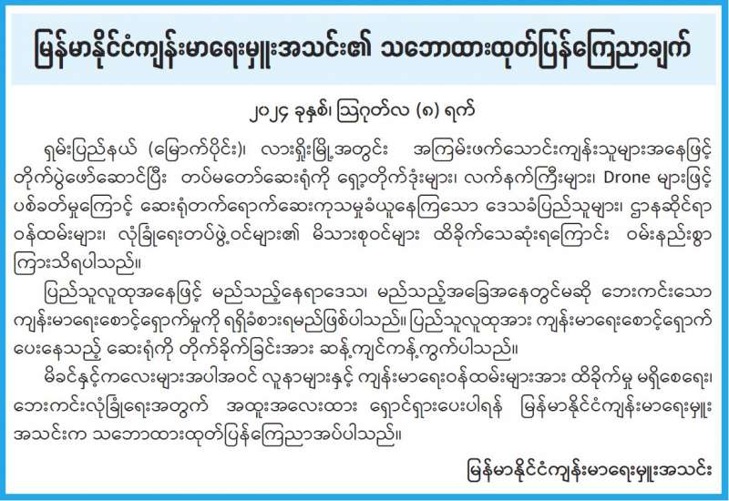 ရှမ်းပြည်နယ်(မြောက်ပိုင်း)၊ လားရှိုးမြို့အတွင်း အကြမ်းဖက်သောင်းကျန်းသူများအနေဖြင့် တိုက်ပွဲဖော်ဆောင်ပြီး တပ်မတော်ဆေးရုံကို ရှော့တိုက်ဒုံးများ၊ လက်နက်ကြီးများ၊ Drone များဖြင့် ပစ်ခတ်မှုကြောင့် ဆေးရုံတက်ရောက်ဆေးကုသမှုခံယူနေကြသော ဒေသခံပြည်သူများ၊ ဌာနဆိုင်ရာဝန်ထမ်းများ၊ လုံခြုံရေးတပ်ဖွဲ့ဝင်များ၏ မိသားစုဝင်များ ထိခိုက်သေဆုံးရကြောင်း ဝမ်းနည်းစွာကြား သိရပါသည်။