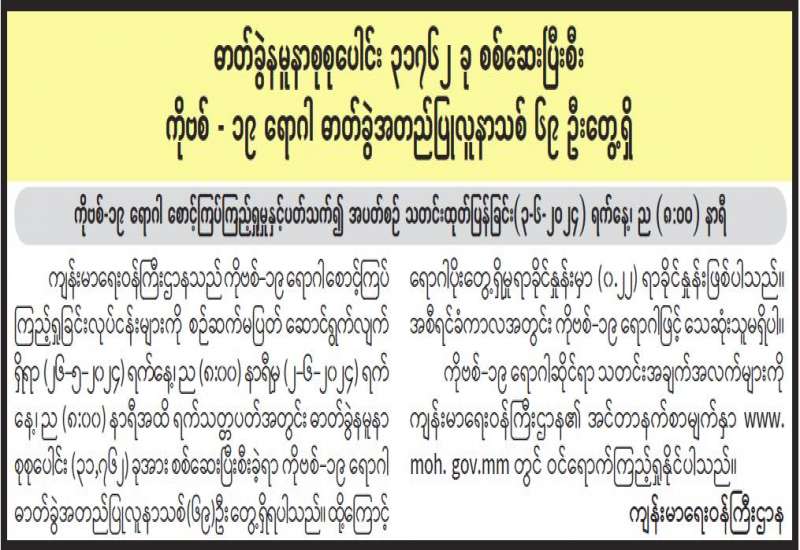 ကျန်းမာရေးဝန်ကြီးဌာနသည် ကိုဗစ်-၁၉ ရောဂါ စောင့်ကြပ် ကြည့်ရှုခြင်းလုပ်ငန်းများကို စဉ်ဆက်မပြတ် ဆောင်ရွက်လျက် ရှိရာ (၂၆-၅-၂၀၂၄) ရက်နေ့၊ ည (၈:၀၀) နာရီမှ (၂-၆-၂၀၂၄) ရက် နေ့၊ ည (၈:၀၀) နာရီအထိ ရက်သတ္တပတ်အတွင်း ဓာတ်ခွဲနမူနာစုစုပေါင်း(၃၁,၇၆၂)ခုအား စစ်ဆေးပြီးစီးခဲ့ရာ ကိုဗစ်-၁၉ ရောဂါ ဓာတ်ခွဲအတည်ပြုလူနာသစ်(၆၉)ဦး တွေ့ရှိရပါသည်။ ထို့ကြောင့် ရောဂါပိုးတွေ့ရှိမှုရာခိုင်နှုန်းမှာ (၀.၂၂) ရာခိုင်နှုန်းဖြစ်ပါသည်။ အစီရင်ခံကာလအတွင်း ကိုဗစ်-၁၉ ရောဂါဖြင့် သေဆုံးသူမရှိပါ။