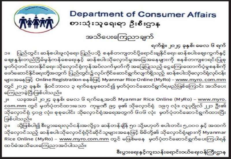 ၁။ ပြည်တွင်း ဆန်စပါးဖူလုံရေး၊ ပြည်ပသို့ စနစ်တကျတင်ပို့ရောင်းချနိုင်ရေး၊ ဆန်စပါးဈေးကွက်နှင့် ဈေးနှုန်းတည်ငြိမ်မှန်ကန်စေရေးနှင့် ဆန်စပါးသိုလှောင်မှုအခြေအနေများကို စနစ်တကျစာရင်းပြုစု မှတ်ပုံတင်ထားနိုင်ရေး၊ သိုလှောင်ရုံကုန်အပ်လက်မှတ်ကို အခြေပြုသည့် ငွေကြေးထောက်ပံ့မှုစနစ်ကို ဖော်ဆောင်နိုင်ရေးတို့အတွက် ပြည်တွင်း၌ လုပ်ကိုင်ဆောင်ရွက်လျက်ရှိသည့် ဆန်စပါးသိုလှောင်ရုံလုပ်ငန်းများအနေဖြင့် Online Registration စနစ်ဖြင့် Myanmar Rice Online (MyRo) - www.myro. com.mm တွင် ၂၀၂၃ ခုနှစ်၊ နိုဝင်ဘာလ ၃ ရက်နေ့မှစတင်၍ မှတ်ပုံတင်ဆောင်ရွက်ရမည်ဖြစ်ကြောင်း အသိပေးကြေညာခဲ့ပြီးဖြစ်ပါသည်။