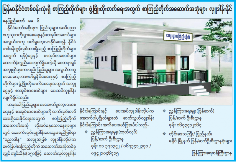 ပို့ဆောင်ရေးနှင့် ဆက်သွယ်ရေးဝန်ကြီးဌာန၊ မြန်မာ့စာတိုက်လုပ်ငန်းမှ မြန်မာနိုင်ငံတစ်ဝန်းရှိ စာကြည့်တိုက်များ ဖွံ့ဖြိုးတိုးတက်ရေးနှင့် ပြည်သူများ စာဖတ်နှုန်းမြင့်တက်စေရန် ရည်ရွယ်၍ တစ်ဖက်တစ်လမ်းမှ ပါဝင်ဝန်ဆောင်မှုပေးသည့်အနေဖြင့် ပြန်ကြားရေးဝန်ကြီးဌာနမှ ဖွင့်လှစ်ထားသော လူထုအခြေပြုဗဟိုဌာန (စာကြည့်တိုက်) များသို့ စာအုပ်များ ပေးပို့လှူဒါန်းလိုပါက မြန်မာ့စာတိုက်လုပ်ငန်းရှိ စာတိုက်များတွင် (အခမဲ့) ပေးပို့နိုင်ပါကြောင်း ကြေညာအပ်ပါသည်။