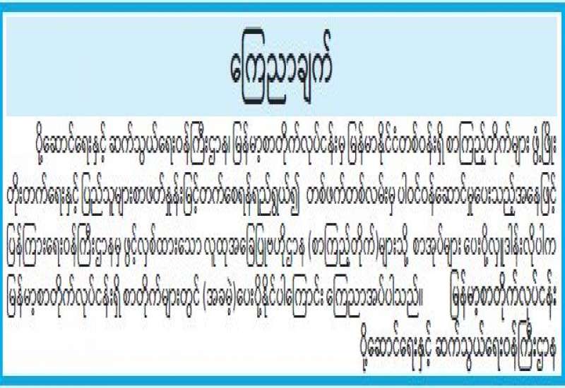 ပို့ဆောင်ရေးနှင့်ဆက်သွယ်ရေးဝန်ကြီးဌာန၊ မြန်မာ့စာတိုက်လုပ်ငန်းမှ မြန်မာနိုင်ငံတစ်ဝန်းရှိ စာကြည့်တိုက်များ ဖွံ့ဖြိုးတိုးတက်ရေးနှင့် ပြည်သူများစာဖတ်နှုန်းမြင့်တက်စေရန်ရည်ရွယ်၍ တစ်ဖက်တစ်လမ်းမှ ပါဝင်ဝန်ဆောင်မှုပေးသည့်အနေဖြင့် ပြန်ကြားရေးဝန်ကြီးဌာနမှ ဖွင့်လှစ်ထားသော လူထုအခြေပြုဗဟိုဌာန (စာကြည့်တိုက်) များသို့ စာအုပ်များပေးပို့လှူဒါန်းလိုပါက မြန်မာ့စာတိုက်လုပ်ငန်းရှိ စာတိုက်များတွင် (အခမဲ့) ပေးပို့နိုင်ပါကြောင်း ကြေညာအပ်ပါသည်။