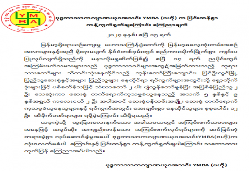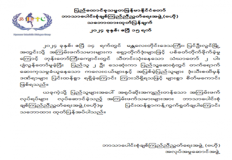 မြန်မာနိုင်ငံ ဟာသပညာရှင်များအစည်းအရုံး အကြမ်းဖက်လုပ်ဆောင်မှုများကို ကန့်ကွက်ရှုတ်ချကြောင်း သဘောထားထုတ်ပြန်ချက်