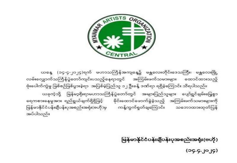 မြန်မာနိုင်ငံ သဘင်အစည်းအရုံး(ဗဟို)၏ သဘောထားထုတ်ပြန်ချက်