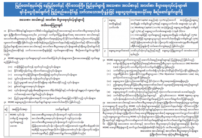 ၁။ နိုင်ငံတော်စီမံအုပ်ချုပ်ရေးကောင်စီ၏ လမ်းညွှန်မှုနှင့်အညီ အသေးစားနှင့် အလတ်စားစီးပွားရေးလုပ်ငန်းများ ဖွံ့ဖြိုးတိုးတက်ရေးဥပဒေ ပုဒ်မ ၂၀ (ဂ) တွင် သတ်မှတ်ပြဋ္ဌာန်းချက်အရ အသေးစား၊ အငယ်စားနှင့် အလတ်စားစီးပွားရေးလုပ်ငန်းများ ဖွံ့ဖြိုးတိုးတက်ရေးရန်ပုံငွေကို နိုင်ငံတော်၏မတည်ထောက်ပံ့ငွေဖြင့် ထူထောင်ထားရှိပြီး ဖြစ်ပါသည်။ အဆိုပါရန်ပုံငွေမှ ပြည်ထောင်စုနယ်မြေ နေပြည်တော်နှင့် တိုင်းဒေသကြီး၊ ပြည်နယ်များရှိ အသေးစား၊ အငယ်စားနှင့် အလတ်စား စီးပွားရေးလုပ်ငန်းများ၏ ရင်းနှီးငွေလိုအပ်ချက်ကို ဖြည့်ဆည်းပေးနိုင်ရန် သက်သာသောအတိုးနှုန်းဖြင့် ထုတ်ချေးပေးနိုင်ရေး စီစဉ်ဆောင်ရွက်လျက်ရှိပါသည်။