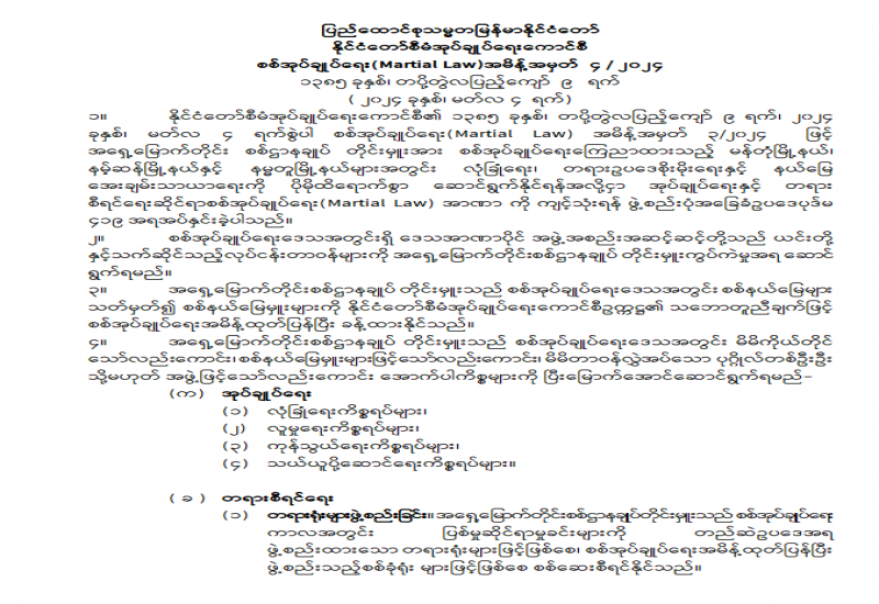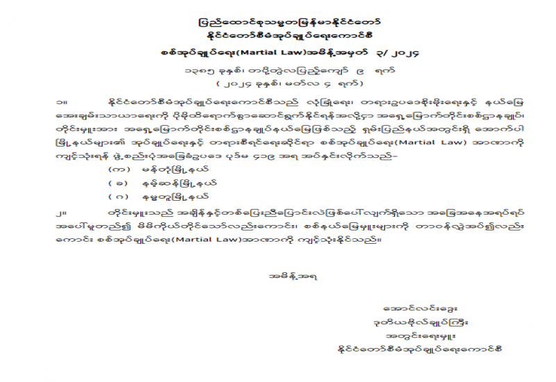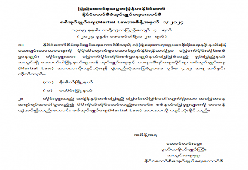 ပြည်ထောင်စုသမ္မတမြန်မာနိုင်ငံတော် နိုင်ငံတော်စီမံအုပ်ချုပ်ရေးကောင်စီ စစ်အုပ်ချုပ်ရေး (Martial Law) အမိန့်အမှတ် ၁/ ၂၀၂၄