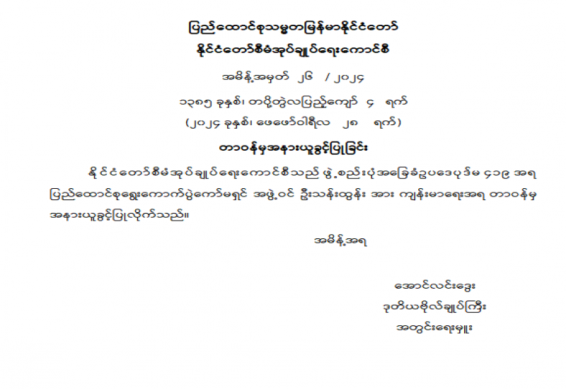 ပြည်ထောင်စုသမ္မတ မြန်မာနိုင်ငံတော် ပြည်ထောင်စုရွေးကောက်ပွဲကော်မရှင်သည် အမိန့်ကြော်ငြာစာအမှတ်(၁၂/၂၀၂၄)ဖြင့် “နိုင်ငံရေးပါတီများ မှတ်ပုံတင်ခြင်းနည်းဥပဒေများကို ပြင်ဆင်သည့်နည်းဥပဒေများ”ကို ၁၃၈၅ ခုနှစ် တပို့တွဲလပြည့်ကျော် ၁၀ ရက်၊ ၂၀၂၄ ခုနှစ် မတ်လ ၅ ရက် ရက်စွဲဖြင့် ထုတ်ပြန်ကြေညာခဲ့သည်။ အဆိုပါနည်းဥပဒေများကို နေ့စဉ်ထုတ်သတင်းစာများတွင် ထည့်သွင်းဖော်ပြပေးသွားမည်ဖြစ်ပြီး ပြည်ထောင်စုရွေးကောက်ပွဲကော်မရှင်ရုံး Website ဖြစ်သည့် www.uec.gov.mm တွင် Download ပြုလုပ်၍ ရယူနိုင်ကြောင်း သတင်းရရှိသည်။