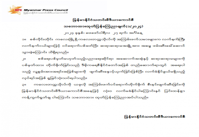 မြန်မာနိုင်ငံသတင်းမီဒီယာကောင်စီ သဘောထားထုတ်ပြန်ကြေညာချက် (၁/၂၀၂၄)