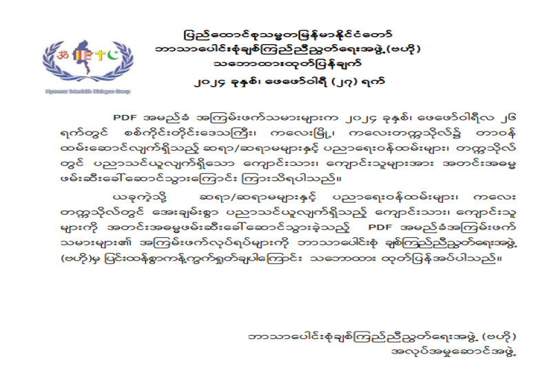 မြန်မာနိုင်ငံ ဧဝံဂေလိခရစ်ယာန်မဟာမိတ်အဖွဲ့ချုပ် သဘောထားထုတ်ပြန်ချက်