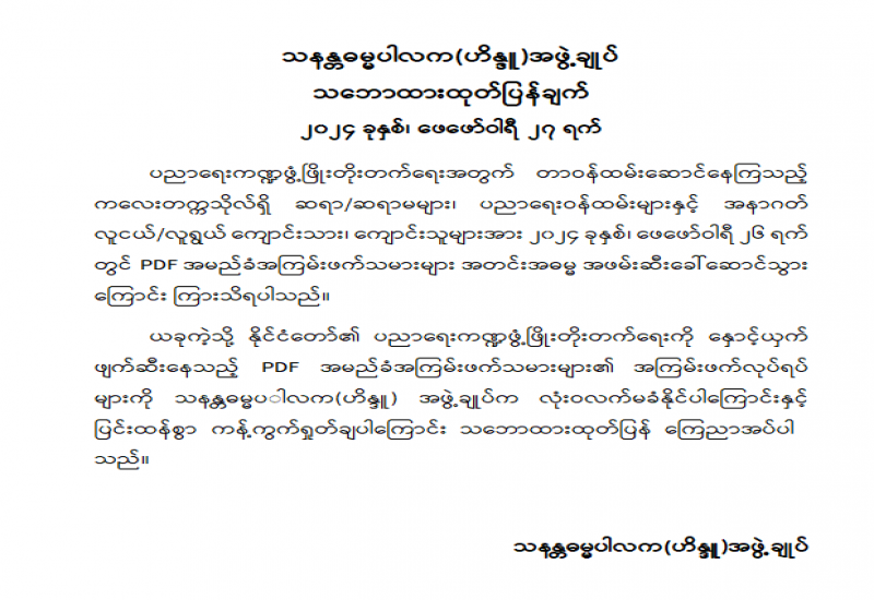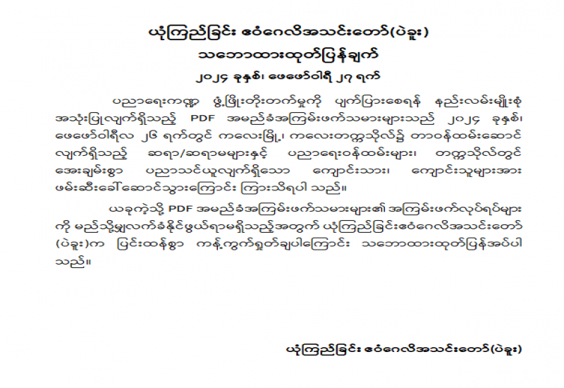 တက္ကသိုလ်ဝင်စာမေးပွဲ ဖြေဆိုခွင့်ကတ်ပြား ထုတ်ယူခြင်းနှင့်ပတ်သက်သော သတင်းကြေညာချက်