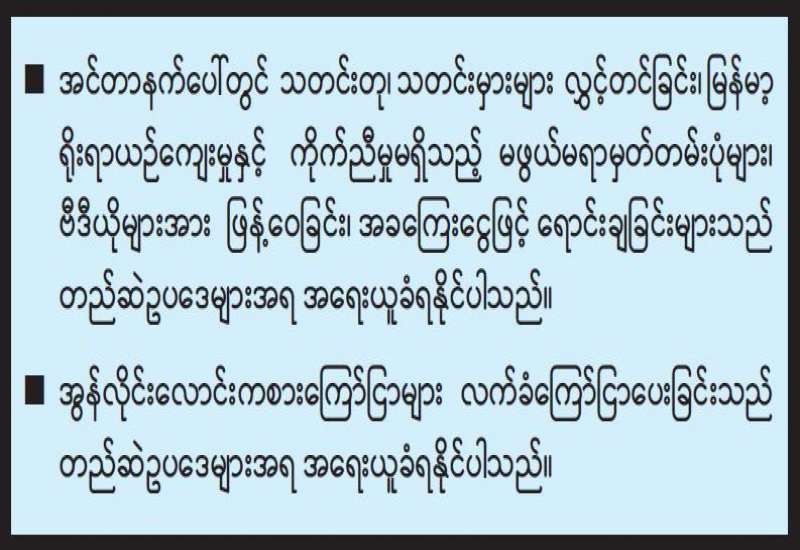 ၂၀၁၄ ခုနှစ်၊ ပုံနှိပ်ခြင်းနှင့်ထုတ်ဝေခြင်းလုပ်ငန်းဥပဒေ၊ နည်းဥပဒေများအရ ထုတ်ဝေသူများသည် မိမိတို့ထုတ်ဝေသည့် စာအုပ်စာစောင် ၅ အုပ် သို့မဟုတ် ၅ စောင်ကို ပြန်ကြားရေးဝန်ကြီးဌာနသို့ အဖိုးအခလွတ်ပေးအပ်ရမည်ဖြစ်ပါသည်။ ပြန်ကြားရေးဝန်ကြီးဌာနသည် အဆိုပါစာအုပ်စာစောင်များကို မူပိုင်ခွင့်နှင့်စာအုပ်စာရင်း ၂ အုပ်၊ အမျိုးသားစာပေဆု စိစစ်ရွေးချယ်ရေးကော်မတီသို့ ၂ အုပ်နှင့် အမျိုးသားမှတ်တမ်းများ မော်ကွန်းတိုက်ဦးစီးဌာနသို့ ၁ အုပ် ပေးပို့လျက်ရှိပါသည်။