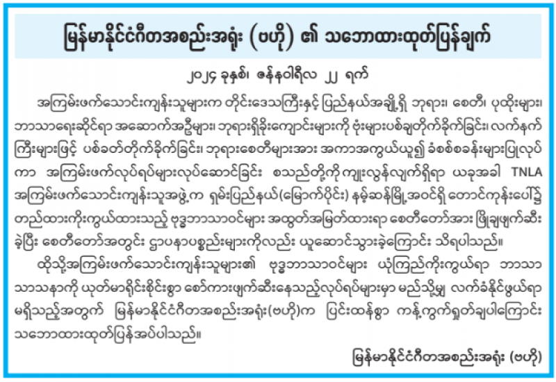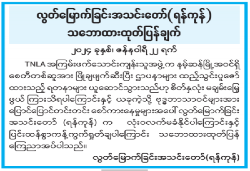 TNLA အကြမ်းဖက်သောင်းကျန်းသူအဖွဲ့က နမ့်ဆန်မြို့အဝင်ရှိ စေတီတစ်ဆူအား ဖြိုချဖျက်ဆီးပြီး ဌာပနာများ ထည့်သွင်းပူဇော် ထားသည့် ရတနာများ ယူဆောင်သွားသည်ဟု စိတ်နှလုံး မချမ်းမြေ့ ဖွယ် ကြားသိရပါကြောင်းနှင့် ယခုကဲ့သို့ ဗုဒ္ဓဘာသာဝင်များအား ပြောင်ပြောင်တင်းတင်း စော်ကားနေမှုများအပေါ် လွတ်မြောက်ခြင်း အသင်းတော် (ရန်ကုန်) က လုံးဝလက်မခံနိုင်ပါကြောင်းနှင့် ပြင်းထန်စွာကန့်ကွက်ရှုတ်ချပါကြောင်း သဘောထားထုတ်ပြန် ကြေညာအပ်ပါသည်။