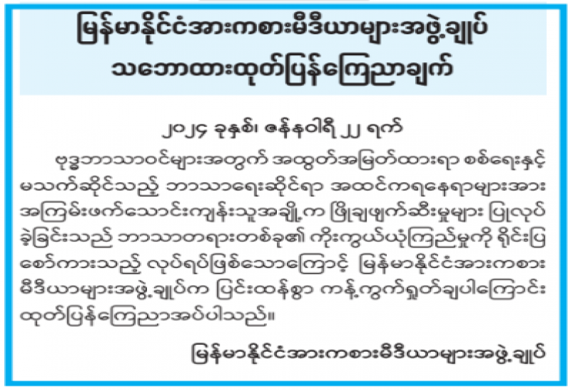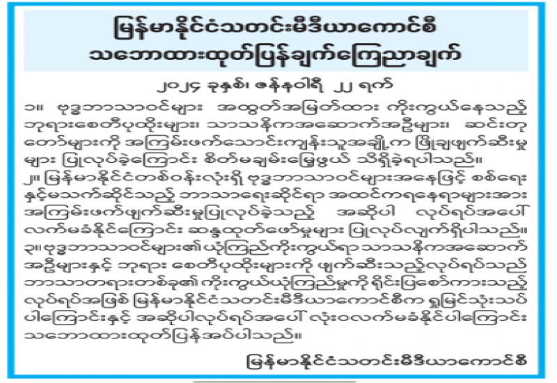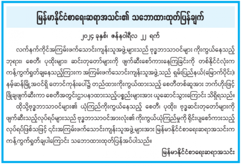 ဗုဒ္ဓဘာသာဝင်များအတွက် အထွတ်အမြတ်ထားရာ စစ်ရေးနှင့် မသက်ဆိုင်သည့် ဘာသာရေးဆိုင်ရာ အထင်ကရနေရာများအား အကြမ်းဖက်သောင်းကျန်းသူအချို့က ဖြိုချဖျက်ဆီးမှုများ ပြုလုပ် ခဲ့ခြင်းသည် ဘာသာတရားတစ်ခု၏ ကိုးကွယ်ယုံကြည်မှုကို ရိုင်းပြ စော်ကားသည့် လုပ်ရပ်ဖြစ်သောကြောင့် မြန်မာနိုင်ငံအားကစားမီဒီယာများအဖွဲ့ချုပ်က ပြင်းထန်စွာ ကန့်ကွက်ရှုတ်ချပါကြောင်း ထုတ်ပြန်ကြေညာအပ်ပါသည်။