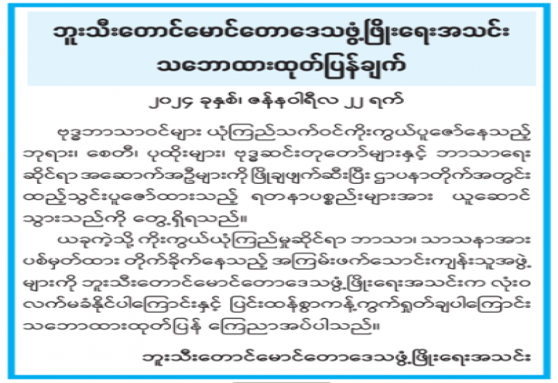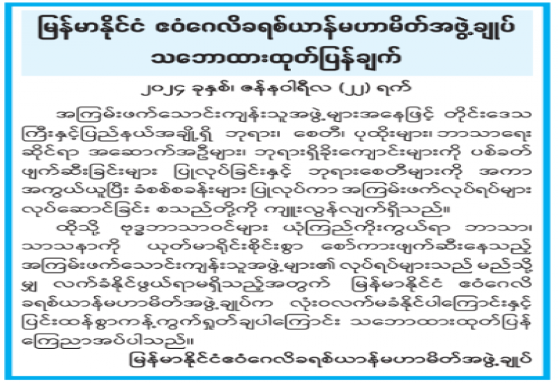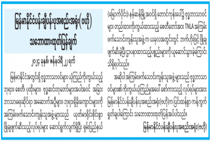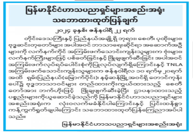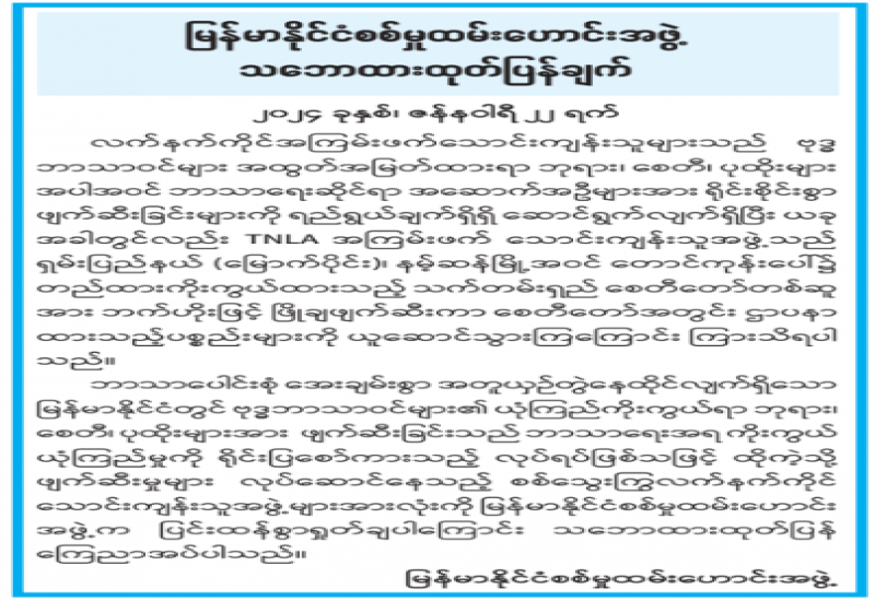 တိုင်းဒေသကြီးနှင့် ပြည်နယ်အချို့ရှိ ဘုရား၊ စေတီ၊ ပုထိုးများ၊ ဗုဒ္ဓဆင်းတုတော်များအပါအဝင် ဘာသာရေးဆိုင်ရာ အဆောက်အဦများကို လက်နက်ကိုင် အကြမ်းဖက်သောင်းကျန်းသူများက ဗုံးများ၊ လက်နက်ကြီးများဖြင့် ပစ်ခတ်ခြင်းနှင့် ဖြိုချဖျက်ဆီးခြင်း အပါအဝင် အကြမ်းဖက်လုပ်ရပ်ပေါင်းစုံကိုပြုလုပ်လျက်ရှိကြောင်းနှင့် TNLA အကြမ်းဖက်သောင်းကျန်းသူများက ဇန်နဝါရီလ ၁၀ ရက်မှ ၂၀ ရက် အထိ ရှမ်းပြည်နယ်(မြောက်ပိုင်း)၊ နမ့်ဆန်မြို့အဝင်ရှိ တောင်ကုန်းပေါ်၌ ဗုဒ္ဓဘာသာဝင်များ တည်ထားကိုးကွယ်ထားသည့် စေတီ တော်အား ဘက်ဟိုးဖြင့် ဖြိုချဖျက်ဆီးခဲ့ပြီး ဌာပနာထားသည့် ပစ္စည်းများကိုယူဆောင်ခဲ့သည်ကို မြန်မာနိုင်ငံဟာသပညာရှင်များ အစည်းအရုံးက လုံးဝလက်မခံနိုင်ပါကြောင်းနှင့် ပြင်းထန်စွာ ကန့်ကွက်ရှုတ်ချပါကြောင်း သဘောထားထုတ်ပြန်ကြေညာအပ်ပါသည်။