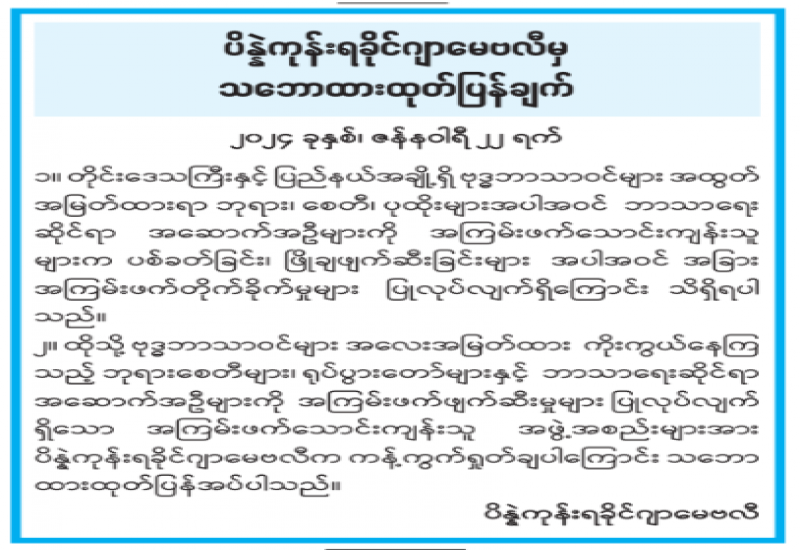 ၁။ တိုင်းဒေသကြီးနှင့် ပြည်နယ်အချို့ရှိ ဗုဒ္ဓဘာသာဝင်များ အထွတ် အမြတ်ထားရာ ဘုရား၊ စေတီ၊ ပုထိုးများအပါအဝင် ဘာသာရေး ဆိုင်ရာ အဆောက်အဦများကို အကြမ်းဖက်သောင်းကျန်းသူ များက ပစ်ခတ်ခြင်း၊ ဖြိုချဖျက်ဆီးခြင်းများ အပါအဝင် အခြား အကြမ်းဖက်တိုက်ခိုက်မှုများ ပြုလုပ်လျက်ရှိကြောင်း သိရှိရပါ သည်။