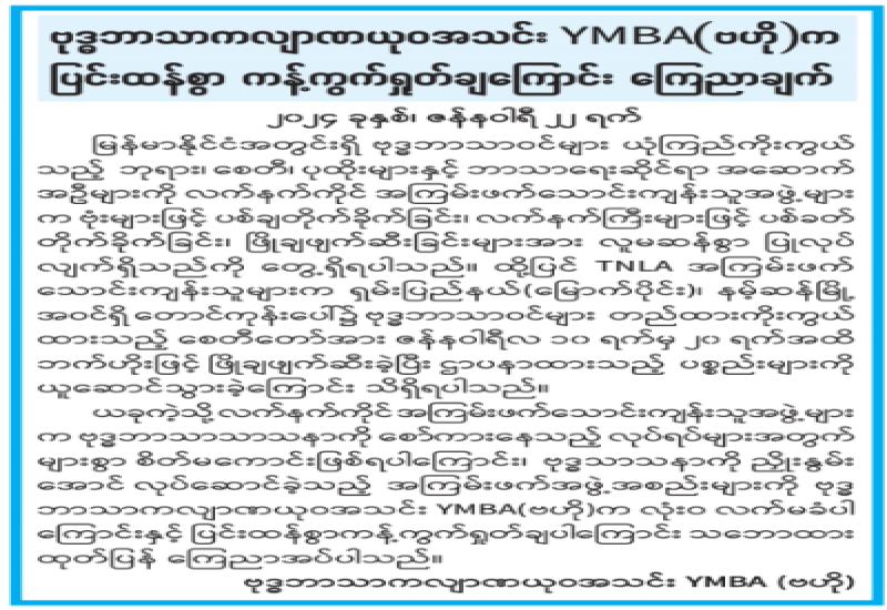 မြန်မာနိုင်ငံအတွင်းရှိ ဗုဒ္ဓဘာသာဝင်များ ယုံကြည်ကိုးကွယ်သည့် ဘုရား၊ စေတီ၊ ပုထိုးများနှင့် ဘာသာရေးဆိုင်ရာ အဆောက်အဦများကို လက်နက်ကိုင်အကြမ်းဖက်သောင်းကျန်းသူအဖွဲ့များက ဗုံးများဖြင့ပစ်ချတိုက်ခိုက်ခြင်း၊ လက်နက်ကြီးများဖြင့် ပစ်ခတ် တိုက်ခိုက်ခြင်း၊ ဖြိုချဖျက်ဆီးခြင်းများအား လူမဆန်စွာပြုလုပ်လျက်ရှိသည်ကို တွေ့ရှိရပါသည်။ ထို့ပြင် TNLA အကြမ်းဖက် သောင်းကျန်းသူများက ရှမ်းပြည်နယ်(မြောက်ပိုင်း)၊ နမ့်ဆန်မြို့ အဝင်ရှိ တောင်ကုန်းပေါ်၌ ဗုဒ္ဓဘာသာဝင်များ တည်ထားကိုးကွယ်ထားသည့် စေတီတော်အား ဇန်နဝါရီလ ၁၀ ရက်မှ ၂၀ ရက်အထိ ဘက်ဟိုးဖြင့် ဖြိုချဖျက်ဆီးခဲ့ပြီး ဌာပနာထားသည့် ပစ္စည်းများကို ယူဆောင်သွားခဲ့ကြောင်း သိရှိရပါသည်။