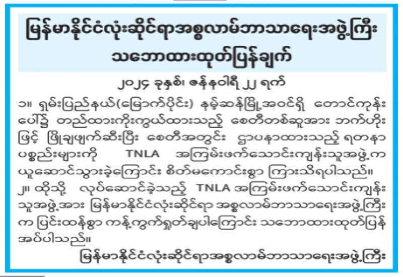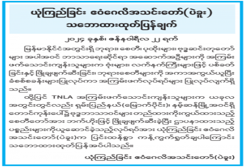 လက်နက်ကိုင် အကြမ်းဖက်သောင်းကျန်းသူအဖွဲ့များသည် ဗုဒ္ဓဘာသာဝင်များ ယုံကြည်ကိုးကွယ်သည့် ဘုရား၊ စေတီ၊ ပုထိုးများအပါအဝင် အခြားဘာသာရေးဆိုင်ရာ အဆောက်အဦများ၊ ဘုရား ရှိခိုးကျောင်းများကို ရိုင်းပြစော်ကားသည့်လုပ်ရပ်များ လုပ်ဆောင် လျက်ရှိသည့်အပြင် ရှမ်းပြည်နယ်(မြောက်ပိုင်း)၊ နမ့်ဆန်မြို့အဝင်ရှိ တောင်ကုန်းပေါ်၌ တည်ထားကိုးကွယ်ထားသည့် စေတီတော်အား TNLA အကြမ်းဖက်သောင်းကျန်းသူအဖွဲ့က ယခုလအတွင်းတွင် ဘက်ဟိုးဖြင့် ဖြိုချဖျက်ဆီးခဲ့ပြီး ဌာပနာထားသည့်ပစ္စည်းများကိုယူဆောင်သွားခဲ့ကြောင်း တွေ့မြင်ကြားသိနေရပါသည်။