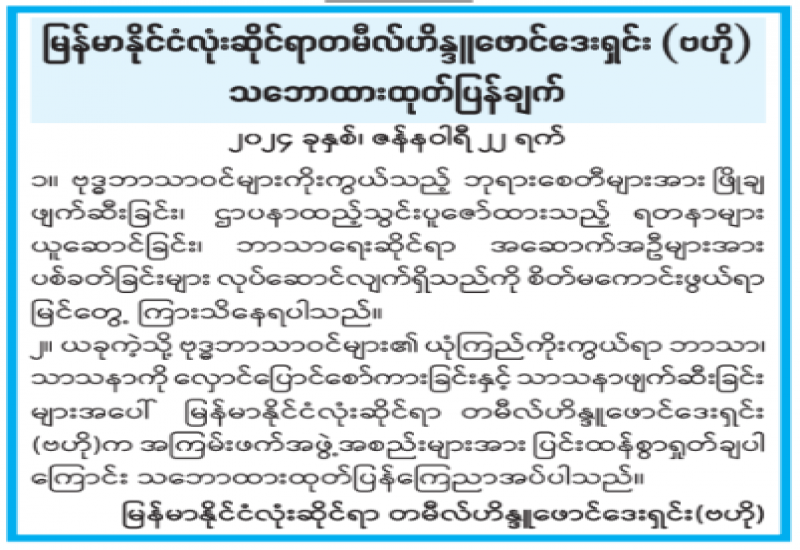 ၁။ ဗုဒ္ဓဘာသာဝင်များကိုးကွယ်သည့် ဘုရားစေတီများအား ဖြိုချဖျက်ဆီးခြင်း၊ ဌာပနာထည့်သွင်းပူဇော်ထားသည့် ရတနာများယူဆောင်ခြင်း၊ ဘာသာရေးဆိုင်ရာ အဆောက်အဦများအား ပစ်ခတ်ခြင်းများ လုပ်ဆောင်လျက်ရှိသည်ကို စိတ်မကောင်းဖွယ်ရာ မြင်တွေ့ကြားသိနေရပါသည်။