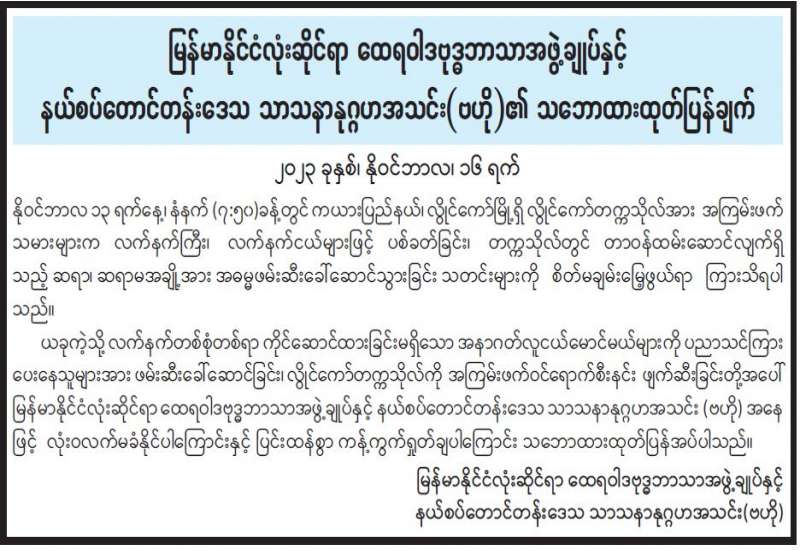 မြန်မာနိုင်ငံလုံးဆိုင်ရာ ထေရဝါဒဗုဒ္ဓဘာသာအဖွဲ့ချုပ်နှင့် နယ်စပ်တောင်တန်းဒေသ သာသနာနုဂ္ဂဟအသင်း (ဗဟို) ၏ သဘောထားထုတ်ပြန်ချက်