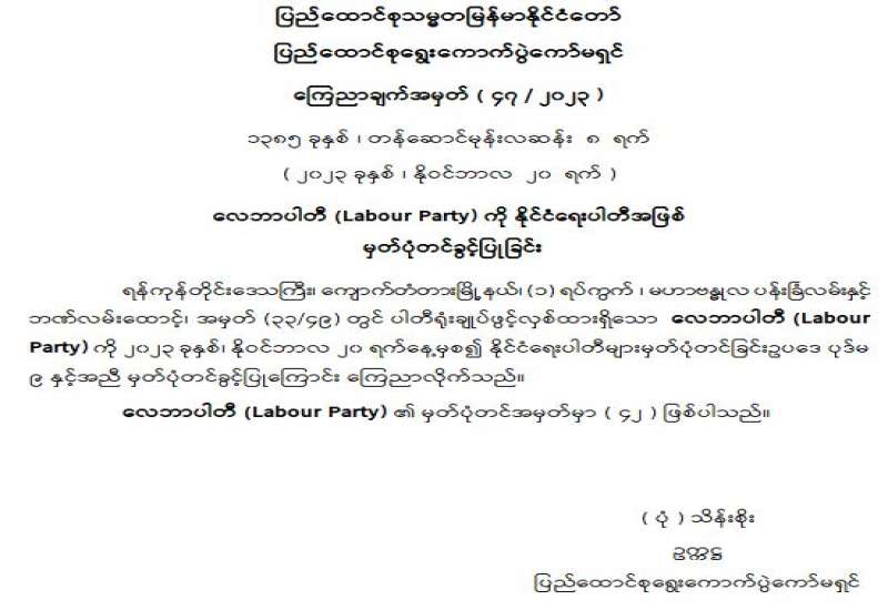 လေဘာပါတီ (Labour Party) ကို နိုင်ငံရေးပါတီအဖြစ် မှတ်ပုံတင်ခွင့်ပြုခြင်း